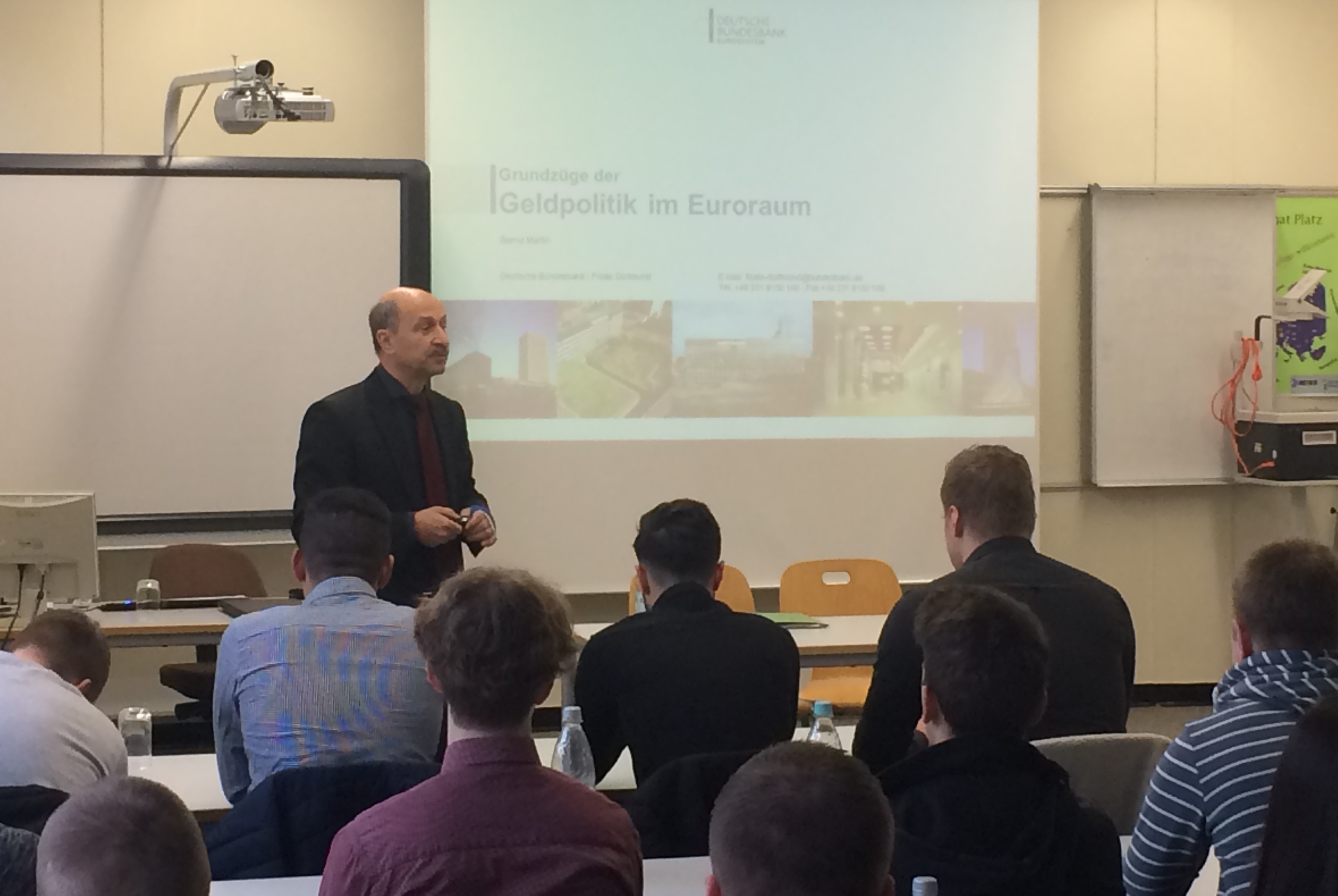 Am 20. Februar 2017 referierte der stellvertretende Leiter der Filiale Dortmund der Deutschen Bundesbank, Bernd Martin, in den Klassen G13A und G13B über das Thema Geldpolitik der Europäischen Zentralbank. In seinem zweistündigen Vortrag an der K2 ermöglichte Herr Martin den Schülerinnen und Schülern der Jahrgangsstufe 13 des Wirtschaftsgymnasiums einen interessanten Einblick in die Instrumente und die Wirkungsweise der Geldpolitik der Europäischen Zentralbank.